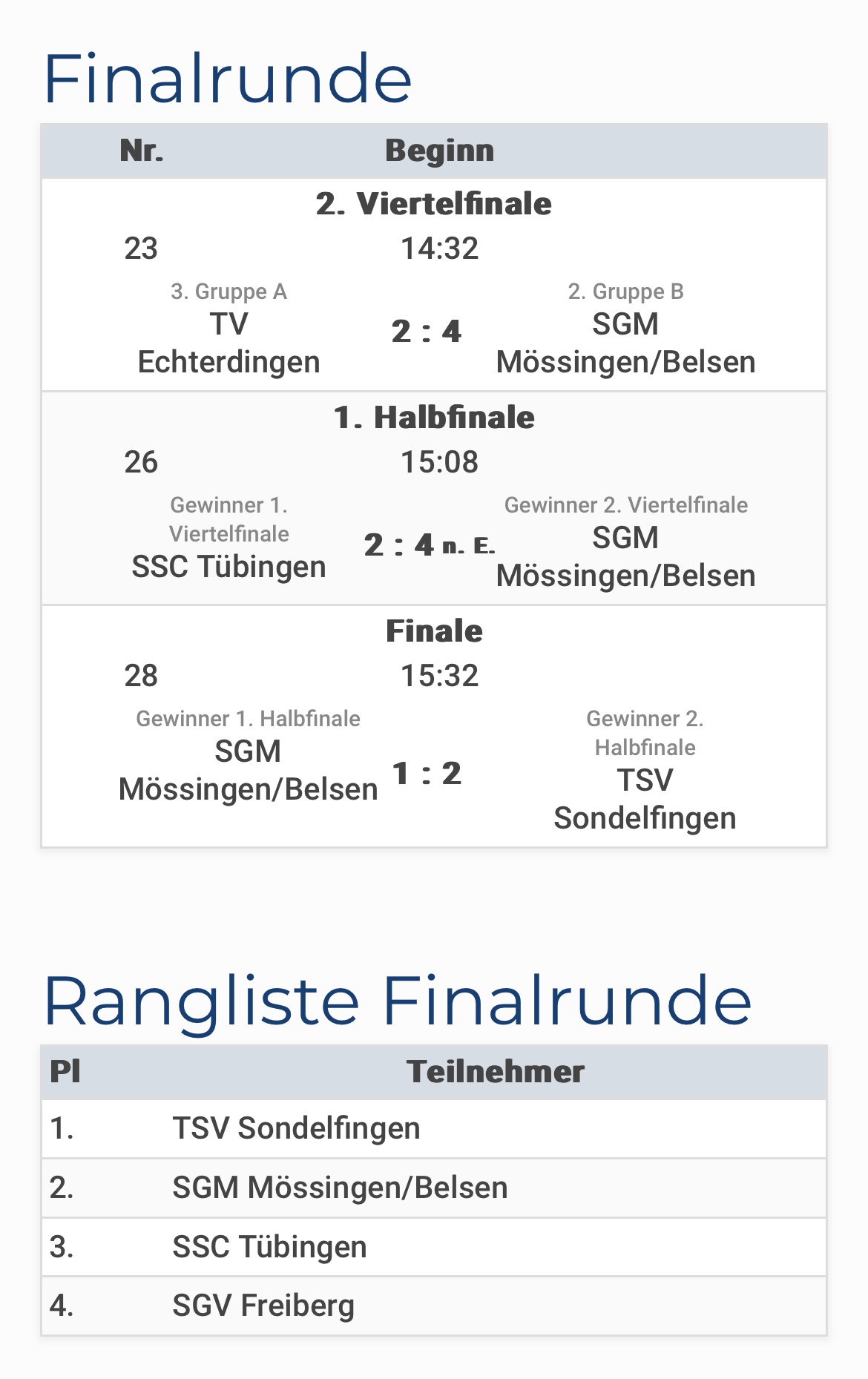 Im Finale wartete der TSV Sondelfingen, bis dahin ungeschlagen und mit nur zwei Gegentoren im gesamten Turnier. Es entwickelte sich ein spannendes Spiel auf Augenhöhe, mit schönen Aktionen auf beiden Seiten. Leider gerieten wir mit 0:2 in Rückstand. Doch die Mannschaft kämpfte sich zurück und konnte mit dem wohl schönsten Spielzug des Turniers den Anschlusstreffer erzielen. Trotz aller Bemühungen blieb es am Ende beim 2:1 für Sondelfingen und damit leider "nur" dem zweiten Platz.
